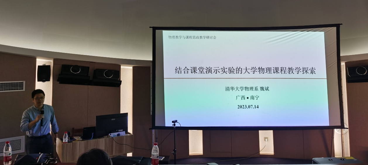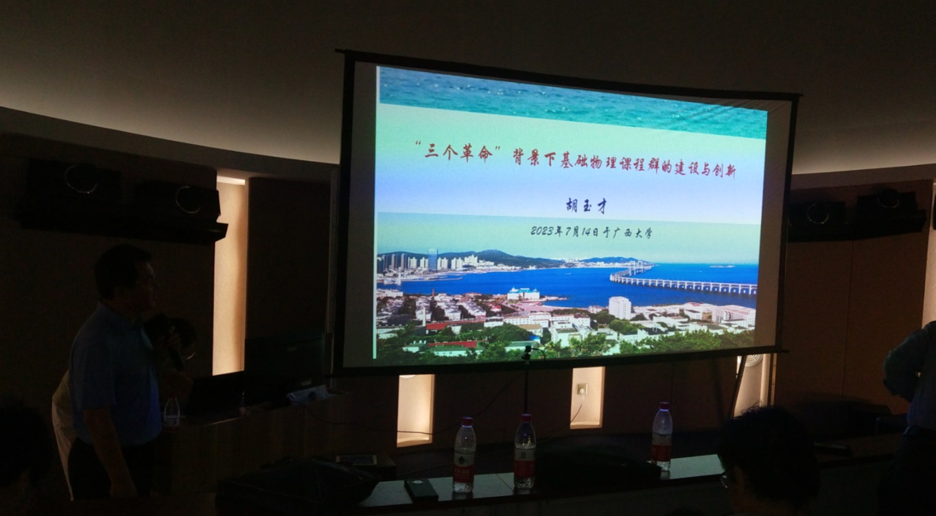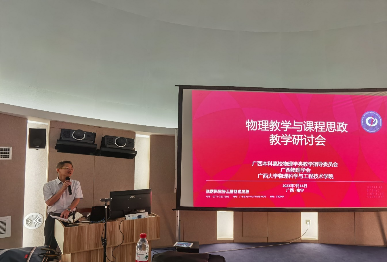 为更好地提升广西区教师课堂教学能力,深化课程思政建设,更好地推进课程改革和思政建设,2023年7月14日下午,广西本科高校物理学类教学指导委员会、广西物理学会携手tyc7111cc太阳成集团在我院天象馆举办《物理教学与课程思政教学研讨会》,研讨会邀请清华大学王青长聘教授、清华大学物理系魏斌副教授、大连海洋大学胡玉才教授三位专家做研讨会专题报告。我院全体教师(线下)、广西物理学会同行(线上)等参会,会议由袁涛书记主持。