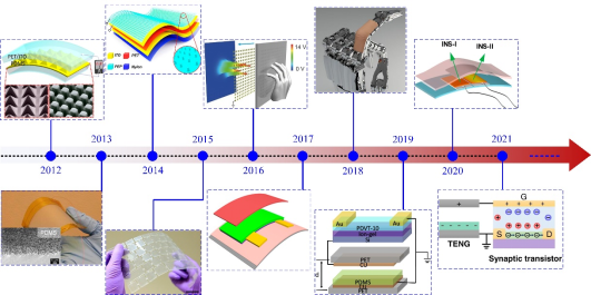可穿戴触觉传感器在智能机器人、医疗监测和人机交互等领域引起了广泛的关注。构建能够响应周围环境刺激而直接产生电信号的主动触觉传感器具有重要意义。摩擦电纳米发电机(TENG)具有高灵敏度、快速响应速度和低成本的优点,并能将周围环境中的各种类型的机械运动转换为电信号,这为设计自驱动触觉传感器提供了有效策略。该工作系统地介绍了TENG作为触觉刺激器用于多功能传感和人工突触的最新进展。首先,详细介绍了TENG作为触觉刺激器在压力、温度、接近感测和物体识别方面的应用。然后,重点介绍了TENG作为触觉刺激器在人工突触方面的研究进展,主要体现在电解质突触晶体管、光电突触晶体管、浮栅突触晶体管、基于还原石墨烯氧化物的人工突触以及基于集成电路的人工突触和神经系统。最后,总结了TENG作为触觉刺激器在多功能传感和人工突触方面所面临的挑战,并展望了未来的发展前景。