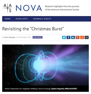 2021年12月9日,我院2019级博士研究生邹乐及其合作者发表在国际权威杂志《天体物理快报》(The Astrophysical Journal Letters)上的论文被美国天文学会刊物研究亮点网站(AAS Nova)选为研究亮点,以“重温圣诞暴”(Revisiting the “Christmas Burst”)为题刊发了专题报道。