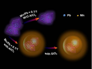 Mn2+掺杂钙钛矿量子点具有明亮的橙红色发光和较大的斯托克斯位移,在白光发光二极管领域具有重要应用前景。为了获得高光致发光量子产率(PLQY)的Mn2+掺杂CsPbCl3钙钛矿量子点,通常需要较高的Mn2+投料浓度。区别于现存的解决方案,我们报道了一种AlCl3辅助合成高PLQY的Mn2+掺杂CsPbCl3钙钛矿量子点。结果表明,在量子点合成过程中引入强Lewis酸AlCl3可有效地提高了Mn2+的掺杂效率,增强了主体激子向Mn2+的能量传递。同时,AlCl3水解后的自钝化氢氧化铝和氧化铝层使量子点形成类似核/壳的结构,有效地钝化了量子点表面的缺陷。结果表明,在极低的进料比下,合成的Mn2+掺杂CsPbCl3钙钛矿量子点的PLQY高达87%。在进一步包覆二氧化硅后,致密的双层保护壳进一步钝化了量子点的缺陷/陷阱,抑制了非辐射复合,使量子点的PLQY达到98%。基于这些量子点构筑的白光LED显示出良好的白光发射,显色指数高达95,表明其在固态照明和显示领域有着广阔的应用前景。