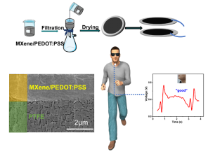 随着传感系统和网络对小型化,智能化和多功能的要求,具有自驱动,结构简单,价格低廉等优势的摩擦纳米发电机(TENG)已成为人体生物传感的首选。TENG中电极层和介电层的无缝接触是实现其高输出性能的基础;但是目前低价,简单的电极层-介电层一体化的设计还具有一定的难度。本研究通过简单的真空抽滤一步法获得了MXene和导电聚合物PEDOT:PSS作为导电层,聚四氟乙烯滤膜作为介电层的一体化柔性薄膜,在此基础上获得柔性超薄的TENG。该TENG作为可穿戴传感器具有高灵敏度,尤其是对微小力(> 6.05 V·N−1)具有短响应(52 ms)和恢复(34 ms)时间,以及出色的稳定性。 该方法可以拓展到采用不同的导电纳米材料来组装TENG的柔性电极层,为制备稳定的电极-摩擦电界面提供了一种简单、价廉而且通用的方法,对于柔性TENG的设计并用于自驱动生物传感具有重要意义。