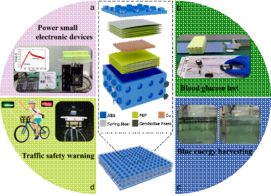 随着能源危机和环境问题的日益突出,在物联网当中构建绿色可持续能源网络系统至关重要。摩擦纳米发电机作为一种高效的低频高熵机械能收集技术,为物联网提供了新的可持续供电方案。然而不同应用场景下需要对TENG进行重新设计和优化,严重影响了其通用性和实用性。基于此,我院蓝色能源团队受乐高积木启发,研制出一种小体积、高能量密度的多功能摩擦纳米发电机(LI-TENG)。其特性类似于电池,具有结构紧密、无需额外导线连接即可快速组装拼接、空间利用率高等特点,可用于各种低频振动机械能的收集。通过采用弹簧钢片拱形叠层结构,单个LI-TENG可实现高达760 nC的转移电荷和210 V的开路电压,在低频(<5 Hz)机械振动下电荷输出体积密度可达7 mCm−3,负载电阻为2.72 MΩ时的体积功率为48.47 Wm−3。LI-TENG成功应用于车辆夜行警示、蓝色能源采集等多种实际场景中。LI-TENG的提出为设计通用性更广的TENG及其阵列提供了新思路。