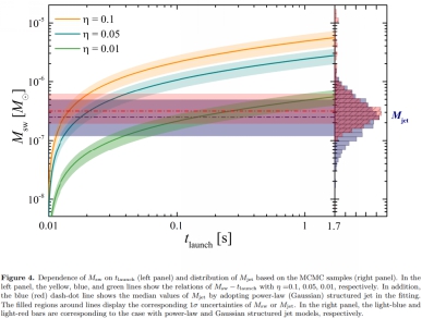 GRB 170817A是与知名的引力波暴GW170817成协的伽玛射线暴,其相对于GW170817有1.74秒的时间延迟。这个时间延迟携带了关于伽马射线暴物理的一些重要信息。在这个工作中,我们提出了一种新方法对这一时间延迟的主要来源进行限制。首先,我们利用结构化喷流模型对GRB 170817A的X射线/光学/射电波段余辉进行了MCMC(马尔科夫链蒙特卡洛方法)拟合,其中,VLBI(甚长基线干涉法)测量得到视超光速结果也被用于限制模型。在这里,我们采用能量和重子载入量随角度有分布的结构化喷流模型进行建模,包括幂律、高斯两种结构化喷流结构。拟合结果发现,两种喷流结构均能够很好地描述观测数据,据此,我们推断出了喷流中所具有的总的重子载入量。通过将喷流的重子载入量与双中子星并合后不同阶段的抛射物进行比较,我们对喷流的发射时间进行限制,发现喷流的发射时间相对于双星并合仅晚数百乃至数十毫秒。我们的这一发现表明,GRB 170817A相对于GW170817的时间延迟主要由喷流传播到其耗散半径的传播时间决定。