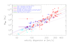Fig. 2: properties of SDSS J0159 in the space of BH mass versus stellar velocity dispersion. Solid five-point-star in red and in purple show the virial BH mass and the TDE model determined BH mass.