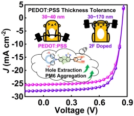 针对以上问题,我院薄膜光伏团队与福建海峡实验室、韩国浦项科技大学合作,选择具有给体-受体-锚定集团的小分子材料2F来修饰PEDOT:PSS,通过提高导电性来克服界面层的膜厚限制。研究证实,2F小分子聚集在了ITO表面,形成了偶极层,从而改善了PEDOT:PSS的聚集方式,提高了电导率、增加了功函数,最终表现出了更好的电荷提取效率以及更低的漏电流密度。因此,2F修饰的PEDOT:PSS界面在基于PM6:Y6作为活性层的有机光伏电池中,实现了17.1%的效率,高于对照组器件的15.7%,效率的提升主要来源于由电荷提取导致的电流密度提高。而且,当进一步将界面层的膜厚提高到170nm后,以2F修饰PEDOT:PSS为界面层器件的效率仍然实现了超过15%的效率,体现了其优异的膜厚容忍性。利用1,3,5-三溴苯作为固体添加剂后,以2F+PEDOT:PSS为界面层的基于PM6:Y6、PM6:BTP-eC9、PM6:L8-BO器件的效率分别达到了18.3%、19.2%和19.1%。该研究揭示了通过小分子策略修饰空穴界面层来提高器件性能的有效性,对于有机光伏电池的产业化应用具有深刻意义。