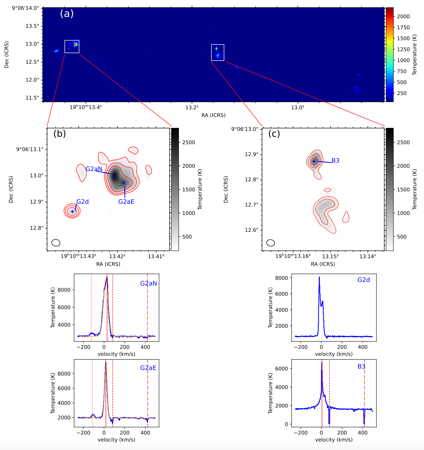 近日,我院博士研究生路哲与合作者利用高灵敏度、高分辨率的ALMA存档数据,在W49A区域开展了角分辨率达0.03角秒的H29▢射电复合线谱线观测,新发现了4个强H29▢射电复合线脉泽发射源。此前,天体中发现强射电复合线脉泽源的个数仅为个位数,此项发现使其增至10余个,显著扩充了该稀缺样本。
