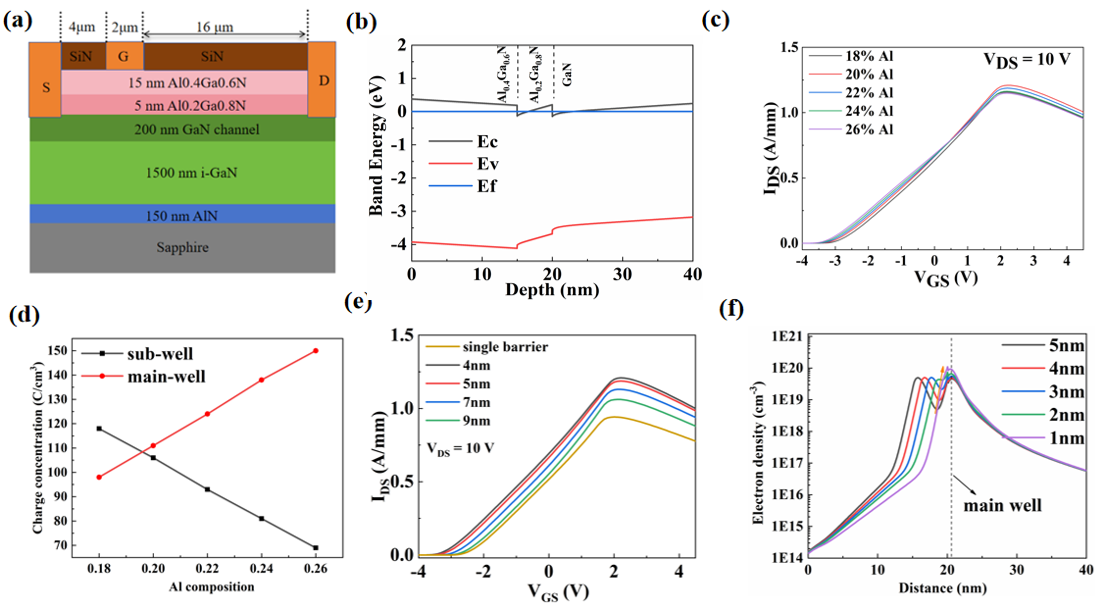 图1.(a)DB-HEMT示意图。(b)Silvaco TCAD模拟的DB-HEMT的能带和费米能级。(c)AlxGa1-xN层具有不同势垒高度的DB-HEMT的传输特性。(d)界面电荷密度与AlxGa1-xN势垒的Al组成之间的关系。(e)具有不同厚度Al0.2Ga0.8N势垒层的DB-HEMT的传输特性。(f)不同厚度Al0.2Ga0.8N势垒层的DB-HEMT的薛定谔-泊松模型模拟的电子密度分布。