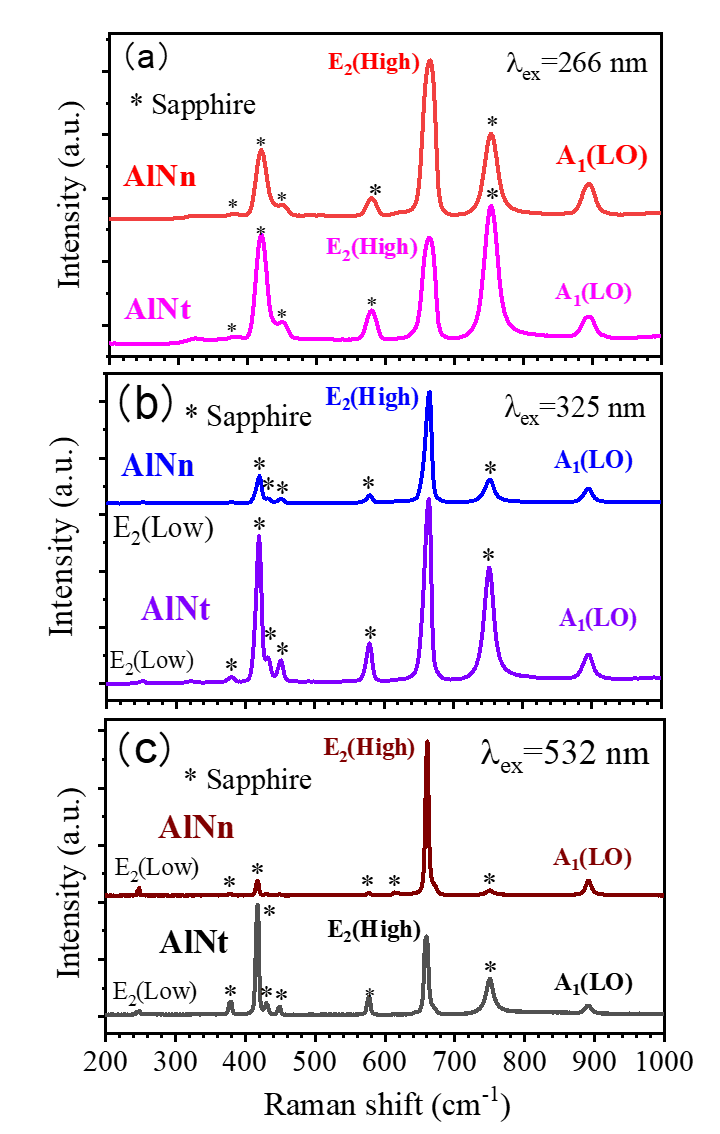 图1、 分别在(a)266、(b)325和(c)532 nm激发下, AlNt和AlNn的室温拉曼光谱