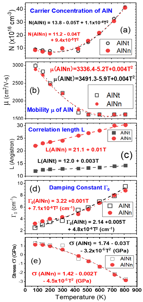 图2、 AlNt和AlNn的温度依赖关系分别为(a)载流子浓度N,(b)迁移率μ,(c)相关长度L,(d)阻尼常数G0,和(e)层应力σ。